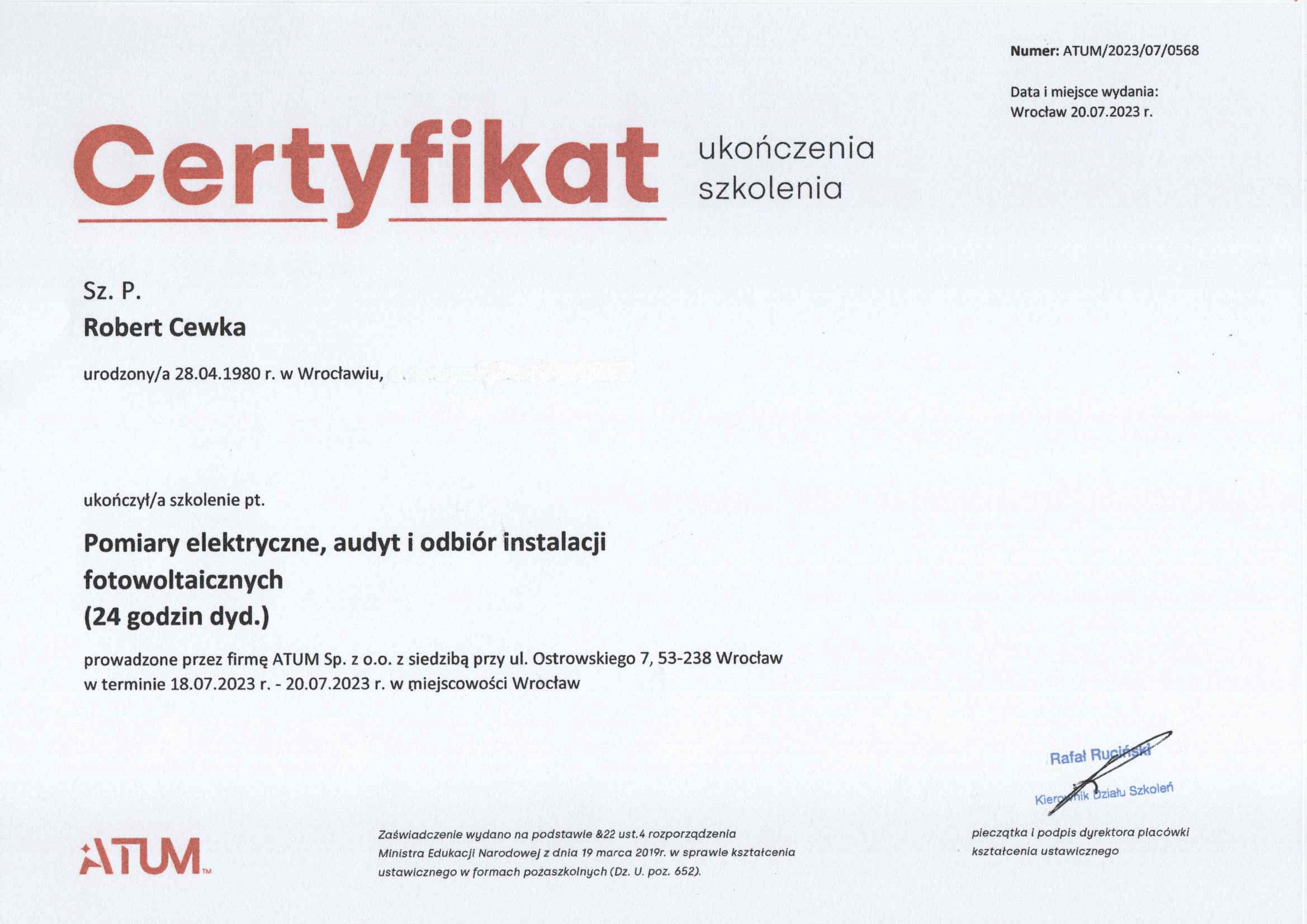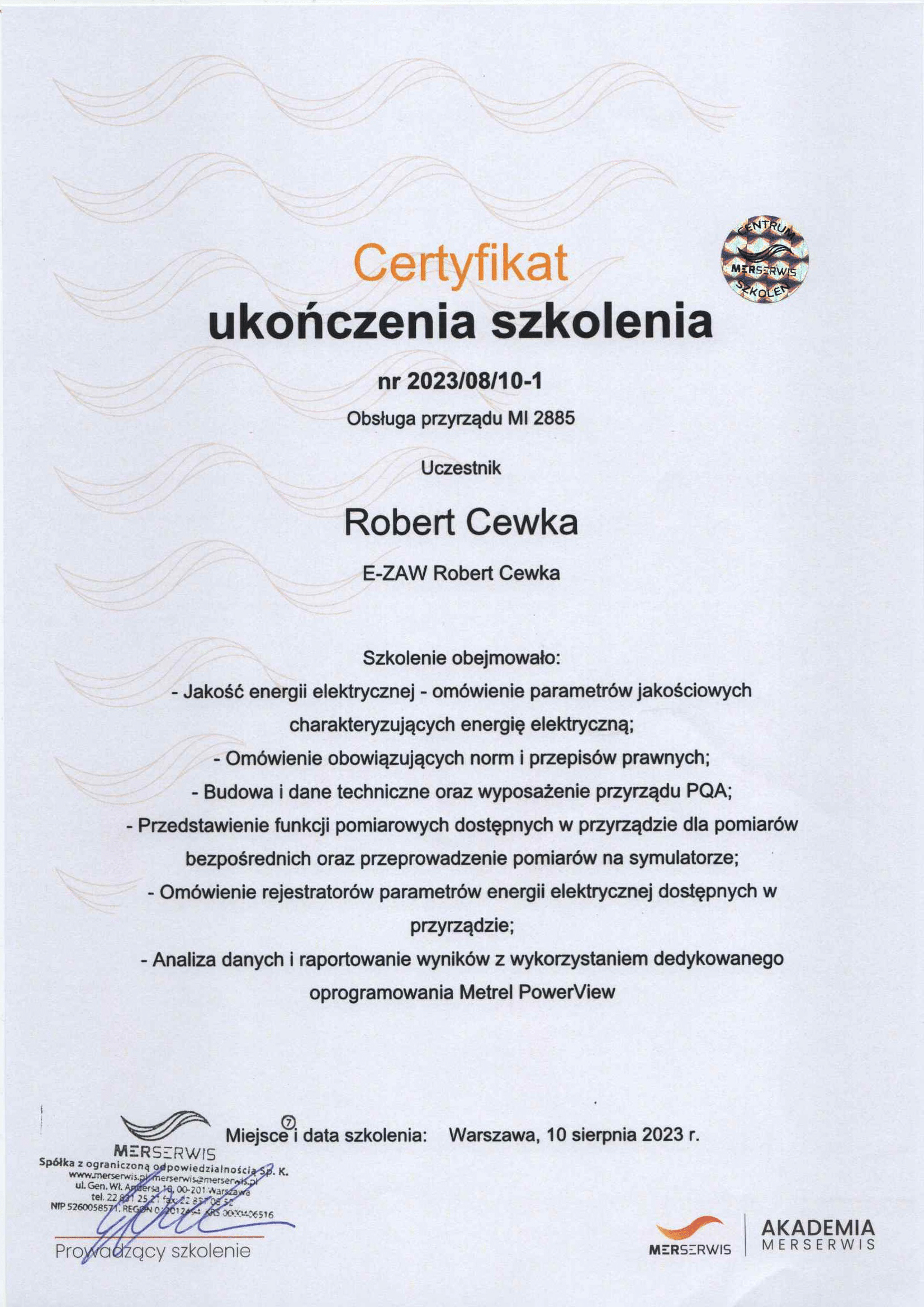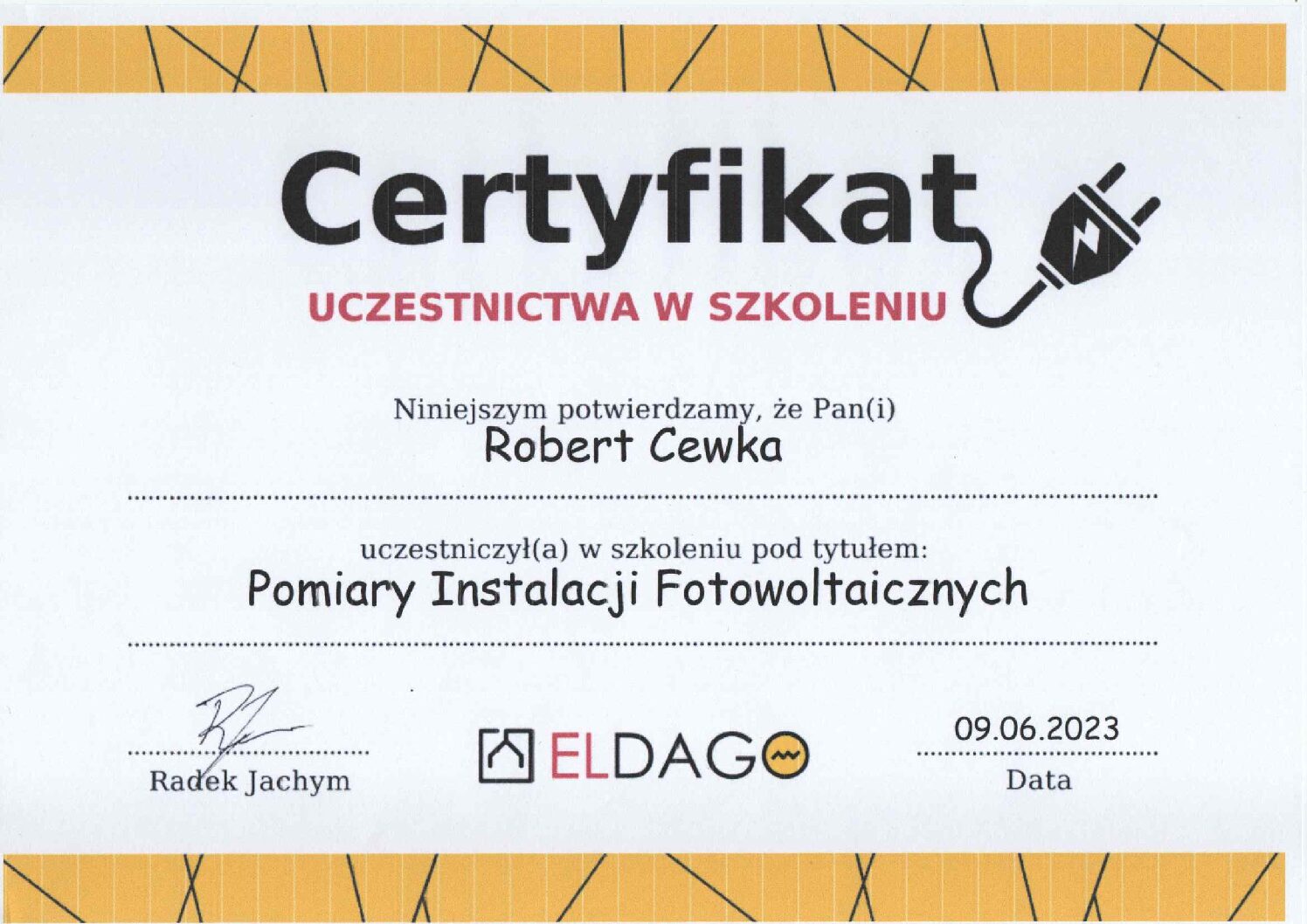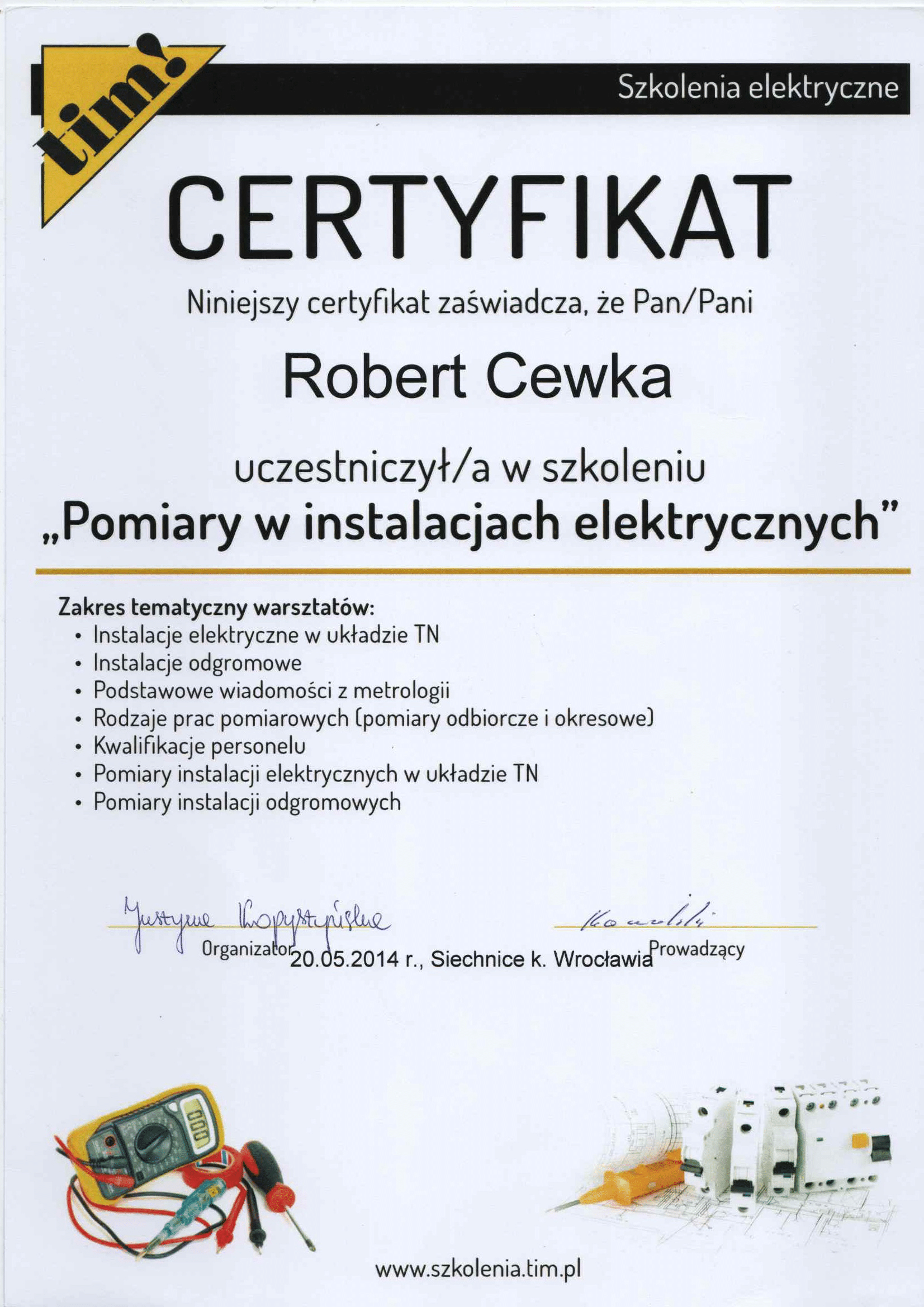 Elektryk Robert Cewka jest bardzo dobrym fachowcem. Cała jego praca jest perfekcyjnie wykonywana i udokumentowana. Wszystkie pomiary wykonuje na miejscu tak aby zleceniodawca też je widział. Nie wymyśla cudów, mówi konkretnie co jest do zrobienia i wymiany. Bardzo polecam jego usługi.